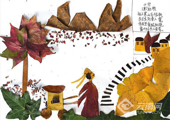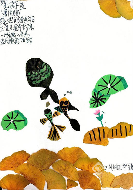 r结合诗词,同学们的画作更增添了几分古韵。他们的画作中有“岁落众芳歇”的惆怅,有“晴空一鹤排云上”的昂扬,有“霜叶红于二月天”的绚烂,也有“夜深篱落一灯明”的孤寂。在树叶和诗词的结合下,孩子们创作出了兼具诗意和秋韵的作品,听到了秋声、看到了秋色,品到了秋味。